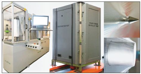比利時Deerlijk的ESTL 公司的FPT-750薄膜測試系統被用于測試薄膜(圖5)。按照不同的預拉伸、測試速度,測試了可能的最大預拉伸斷裂伸長、穿刺和抗震性能。選用了常規的4000 mm/s包覆速度。